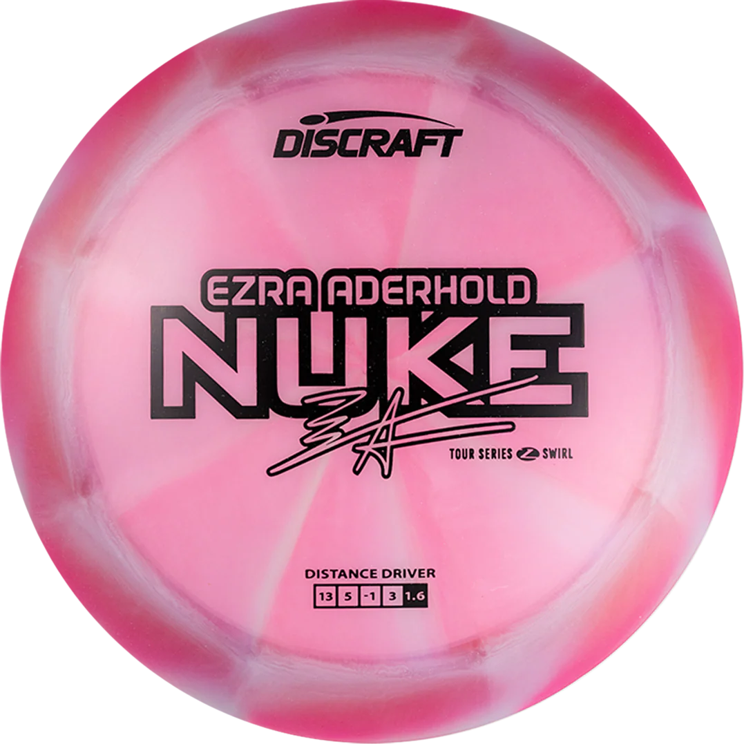 Ezra Aderhold’s Tour Series Nuke is a distance machine—crafted for power throwers who demand both speed and stability. This 2025 edition features our returning Z Swirl plastic, providing a tackier grip and exceptional durability in all conditions. The Nuke’s wide rim and fast profile make it perfect for crushing long drives, while the Z Swirl blend offers added control during high-torque releases. Whether you're lining up for an open-field bomb or carving flex lines down the fairway, this Nuke is built to go the distance.